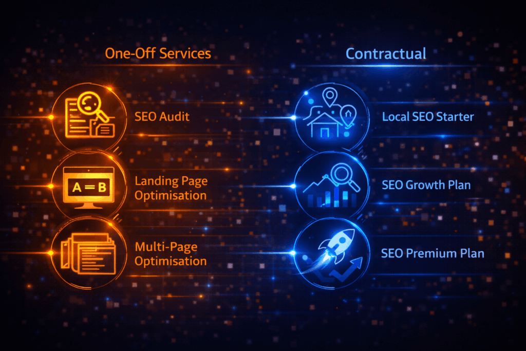Whether you’re looking to strengthen local visibility, scale organic acquisition for a SaaS product, or improve performance through targeted one-off work, our services are built around clarity, consistency, and long-term results.